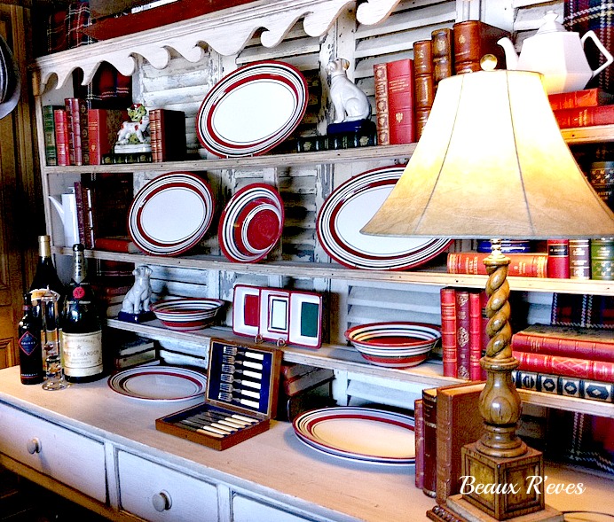Wonderful French Dresser with red and green ironstone dishes.